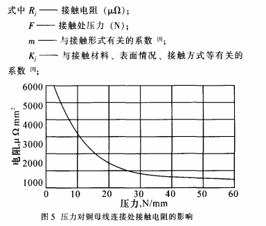由公式(2)可知,影響母線槽搭接面接觸電阻的主要因素有表面的條件K、m和所施加的壓力F。當母線槽表面處理和接觸面積確認了,則Kj、m也確認了,于是接觸電阻Rj與壓力F成為反比聯系,壓力F越大,接觸電阻Rj越小。圖5是壓力對兩片銅導體聯接處接觸電阻的影響曲線圖。