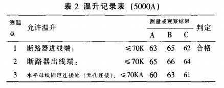 表2是溫升實驗室的質檢人員按照國家規范GB7251.1-1997的有關條款對該樣柜進行溫升實驗,對整個母線槽系統的關鍵處和搭接面進行丈量(測得部分溫升記載)